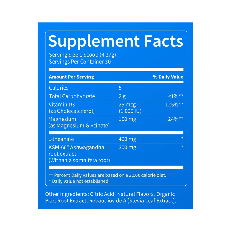 SuperCalm es una mezcla en polvo de bebida relajante con 1000 UI de Vitamina D3, Magnesio Glicinato, L-teanina y Ashwagandha KSM-66®, diseñada para promover una sensación de calma, reducir el estrés y mejorar el bienestar mental. Fórmula de alta biodisponibilidad, ideal para quienes buscan tranquilidad sin somnolencia.